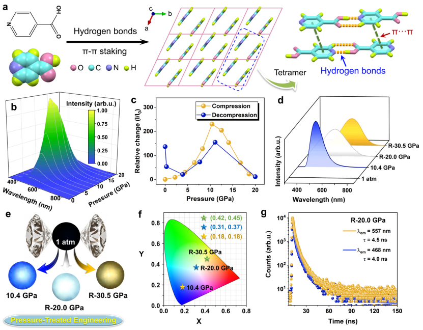近日,环球360手机版登录高压与超硬材料全国重点实验室/综合极端条件高压科学中心杨新一教授课题组在有机分子的多色发光研究方面取得重要进展。提出利用压强工程调控初始不发光的异烟酸(INA)材料中分子间双电荷转移强度,实现从暗态到高质量多色发射(即蓝光、白光、黄光)的可控切换。相关研究成果以“Controllable multicolor emission from initially non-emissive organic molecules by pressure engineering”为题发表在《自然通讯》(Nat. Commun. 2025, 16, 8780)上。