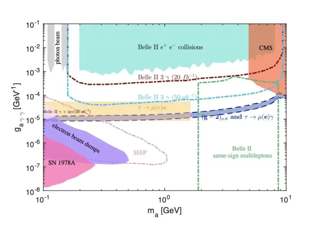 图一: 各种已知以及未来可能的实验结果对类轴子粒子的质量和衰变常数的限制,