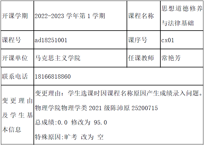 公示日期: 2023年_10月_17日至2023年_10月_23日如有异议请于公示期内向教务处教学运行科反映。 联系人: 邹老师 联系电话: 0431-85168962 相关材料详见附件: 1.吉林大学考核成绩复查、修改登记表 2.学院情况说明(学院教学委员会讨论通过、签字盖章) 3.试卷等相关佐证材料