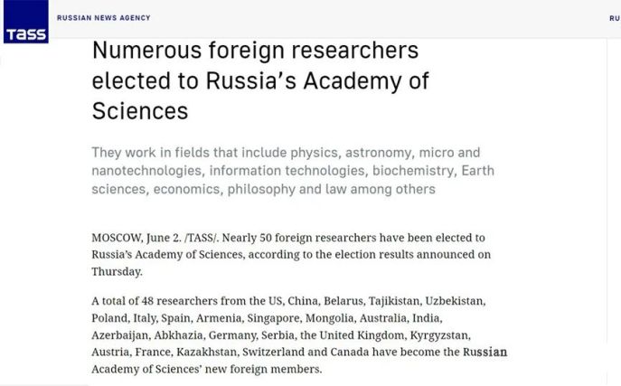 俄罗斯科学院是俄罗斯国家科学技术方面的最高学术机构,于1724年在圣彼得堡成立。自新中国成立以来,我国有郭沫若、李四光、宋健、周光召、路甬祥、白春礼、黄克智、王贻芳、郭华东、黄维等10人当选为外籍院士;华人科学家中有丁肇中、杨振宁、丘成桐等当选。今年,我国有吴季、曹进德、高福、吕永龙、张柏春、黄路生、金之钧等7人当选;华人科学家中有张希成(美国)、许立达(美国)、申泽骧(新加坡)当选。