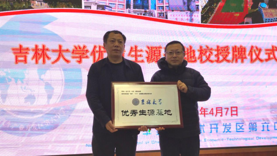 王海军对汽开区六中多年来为吉林大学输送高质量学生表示衷心的感谢,并从历史沿革、师资力量、学科建设、培养定位等方面详细介绍了吉林大学的优良传统和先进的办学理念。邹勃代表吉林大学为汽开区六中颁发了“吉林大学优秀生源基地” 匾牌,与汽开区六中校长李德文签订了《长春汽车经济技术开发区第六中学-吉林大学建设优秀生源基地协议书》。王鑫做了《筑梦起航在吉大》的报告,详细解读了吉林大学的本科生招生政策,并回答了学生和家长在专业选择、培养成长、未来发展等方面普遍关心的问题。