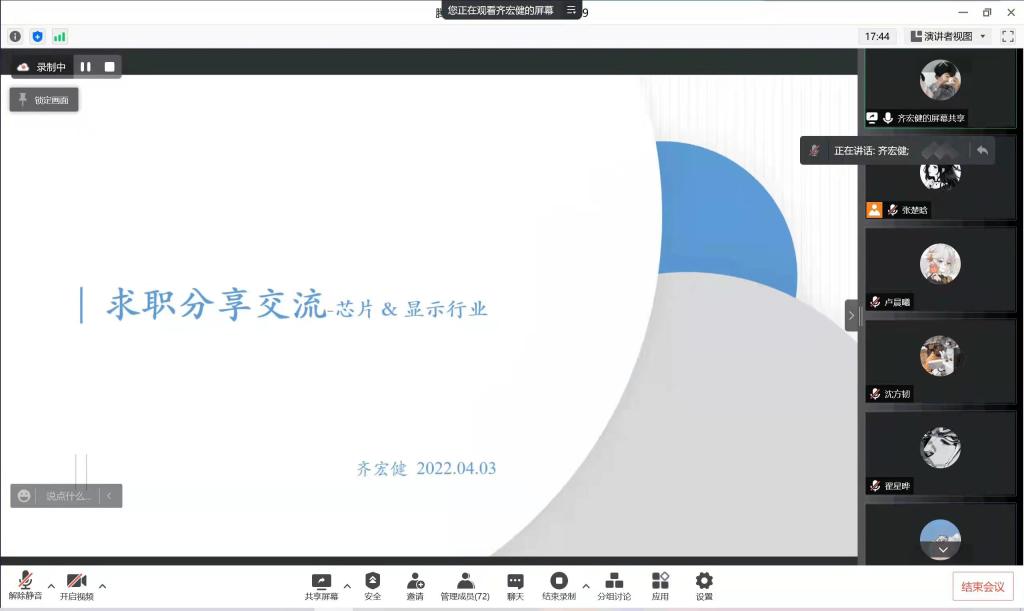 为贯彻落实党中央、国务院 “六稳”“六保”重大战略部署,积极应对疫情对学生求职就业造成的影响,全力推进毕业生高质量充分就业,2022年4月3日下午15:00,环球360手机版登录研究生团委和研究生会推出了“找准人生航向,铸就光辉未来”线上就业分享会。齐宏健、侯学鹏、骆嘉达、闫美洁、王宏岩五位同学分别从企业、教师、公务员篇讲述自己的求职就业经验,共有学院各年级160余名研究生参加了本次就业分享会。